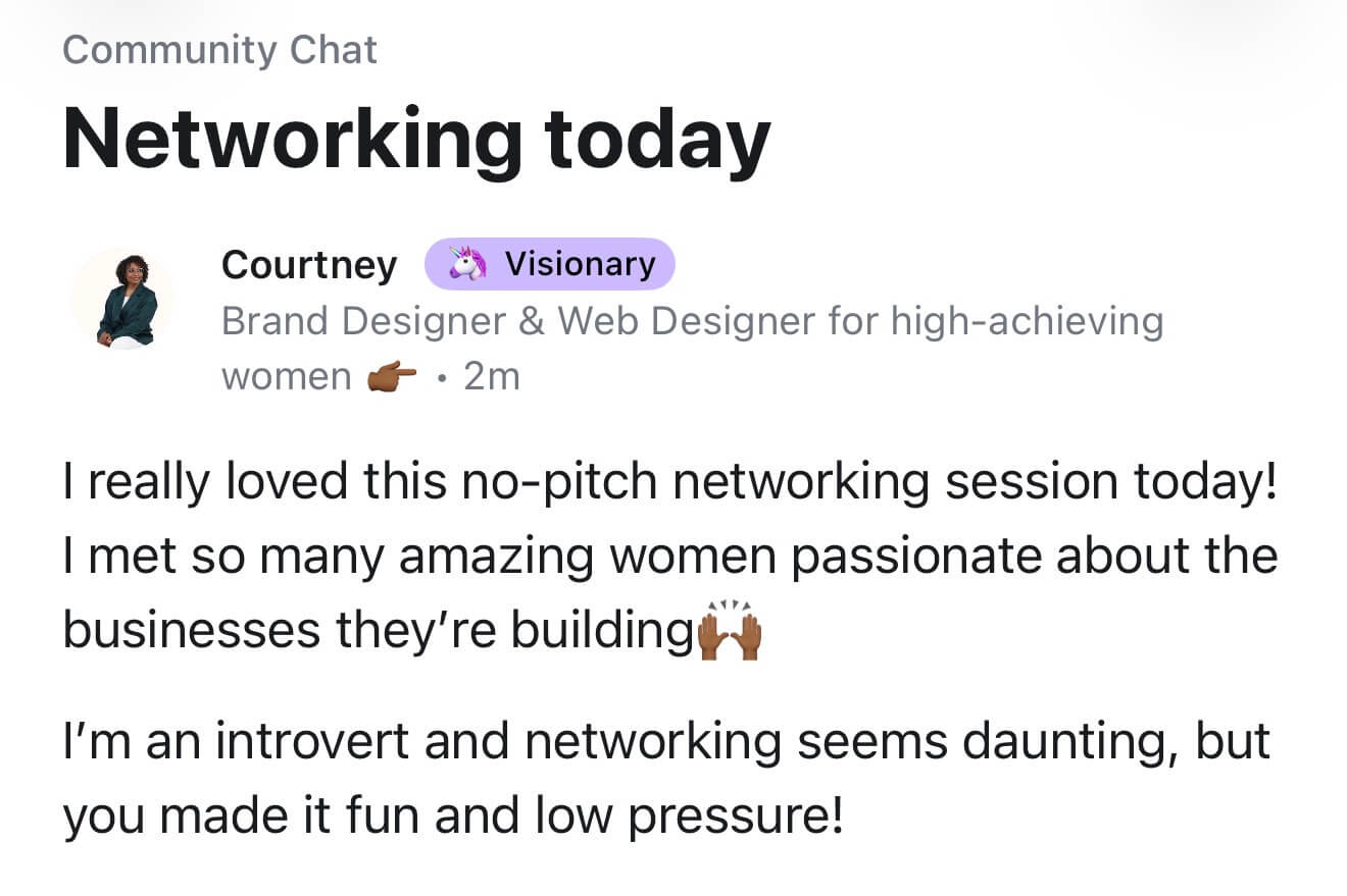 Our members-only community is hosted on Circle so it’s socially distraction-free. It’s a place to network and connect in curated spaces for collaboration, referrals, celebrations, and develop meaningful connection with fellow founders.